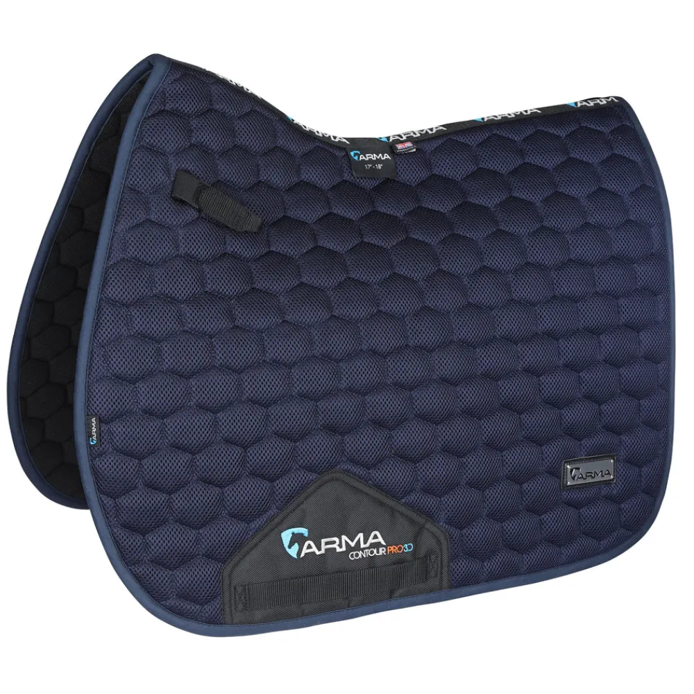 For warm weather riding the ARMA Air Motion Luxe Saddlecloths are both technical and visually attractive to keep the horse comfortable, and look fabulous under the saddle. The open structure airflow fabric outer is deeply quilted in a hexagonal design. AIR MOTION lightweight and highly breathable 3D technology keeps the horse cool and dry. Anti-compression 3D fabric helps to cushion against impact. ULTRA DRI ZONE lining instantly wicks sweat from the horse to reduce the risk of rubbing and increase comfort. Quick drying. Smart metal embossed ARMA badge and embroidered back binding. Girth loops and elasticated D-ring straps for convenient security. Hardwearing girth guards. Machine washable.