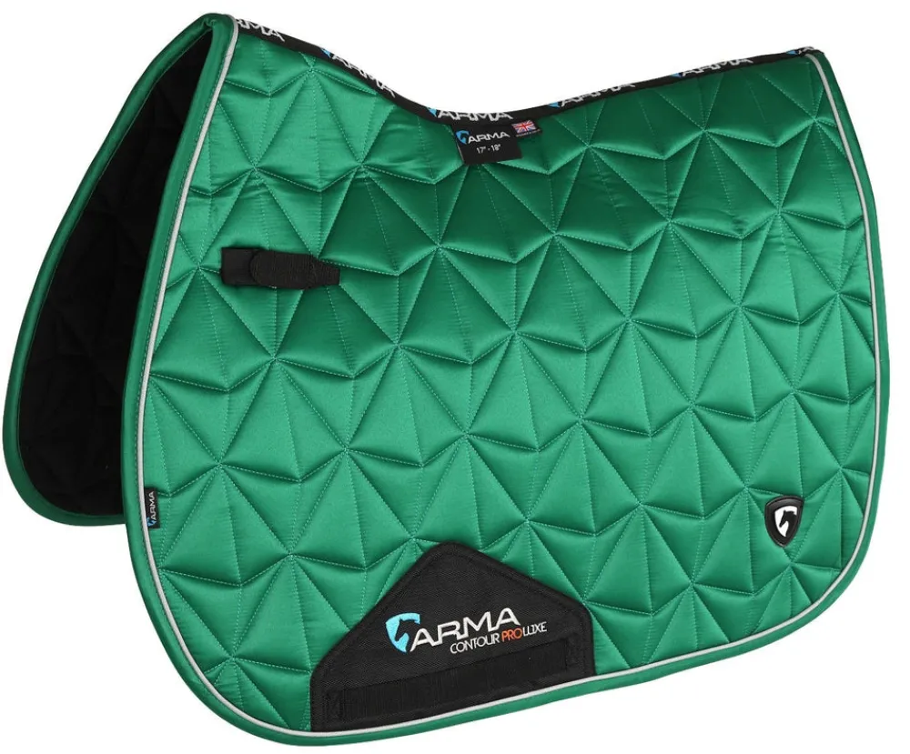 Smart with a silky gloss outer in show stopping colours. The ARMA luxe gloss saddlecloths feature contrasting colour binding and detailed quilt stitching. ULTRA DRI ZONE lining instantly wicks sweat from the horse to reduce the risk of rubbing and increase comfort. Short elasticated D-ring straps for convenient security. Hardwearing girth guards. Machine washable.