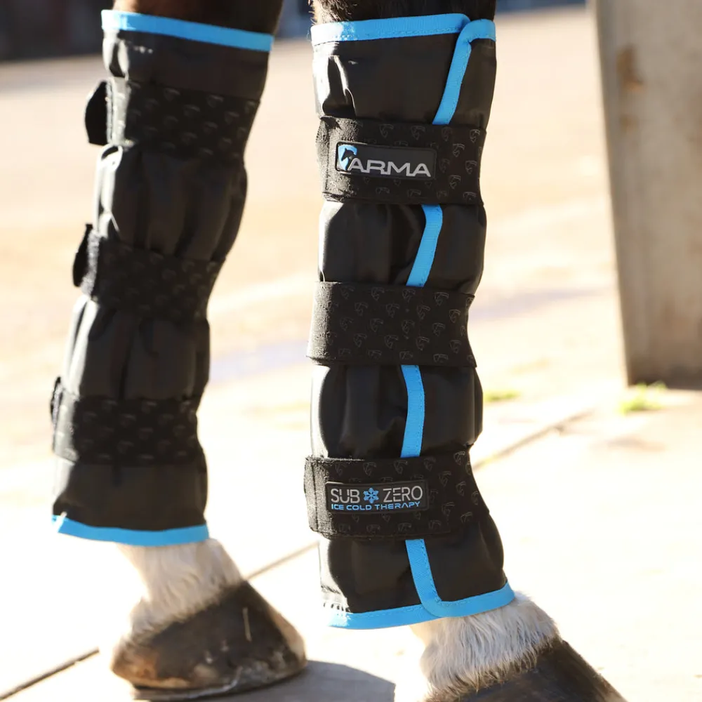 ARMA SubZero Ice Boots use cryotherapy ice cold therapy which reduces blood flow to the treated area, helping to speed up recovery. Useful in daily remedial management, post exercise extreme cold therapy is also helpful for treating acute injury; reducing the inflammatory response and for analgesic benefit to reduce pain. Quick and easy to use and suitable for any area of the horse leg. Chill boots in the freezer to activate the gel and use immediately or store in a cool bag if using out and about. Wrapped around the affected area of the leg, the 32 gel cushions in each boot conform to the leg shape for full coverage, quick close elastic straps secure the fit. Suitable for use on the front or hind legs. Set of 2.