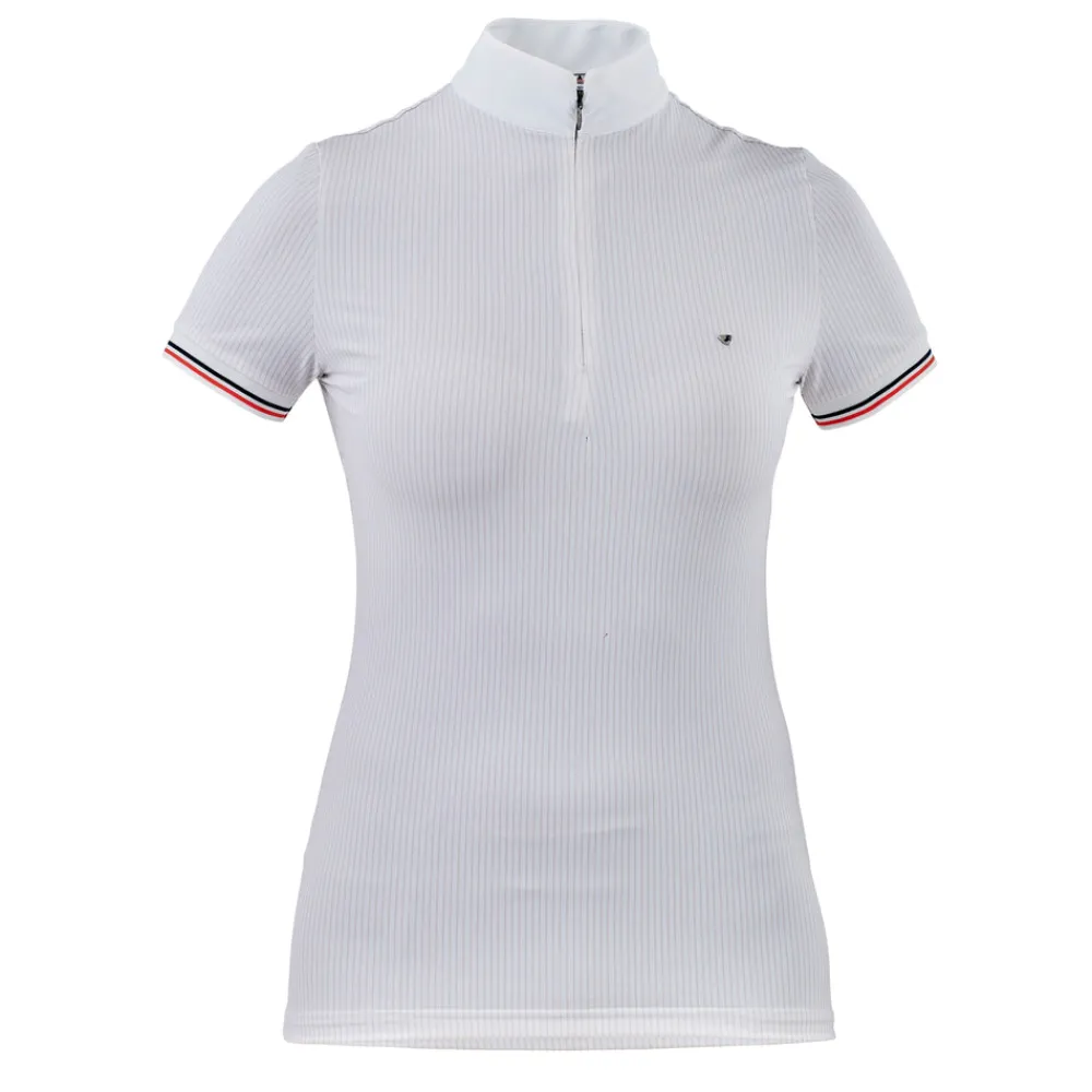 Fresh feeling in looks and performance, the Arcaster short sleeve show shirt has timeless appeal. Smooth and quick drying, fabric is light and cool and stretches with the rider’s movement. A highline neck features an inset 1/4 zip fastening for additional ventilation out of the arena. A slim contour shape looks neat, sleeves are trimmed with signature stripe knitted cuffs. The back of the shirt is printed with a subtle lattice design that catches the light for added lustre. Further detail: main fabric UPF50+, discrete neck zip, 4-way stretch, moisture wicking, highly breathable, comfort seams, signature ribbon tab, Aubrion badge and prints.