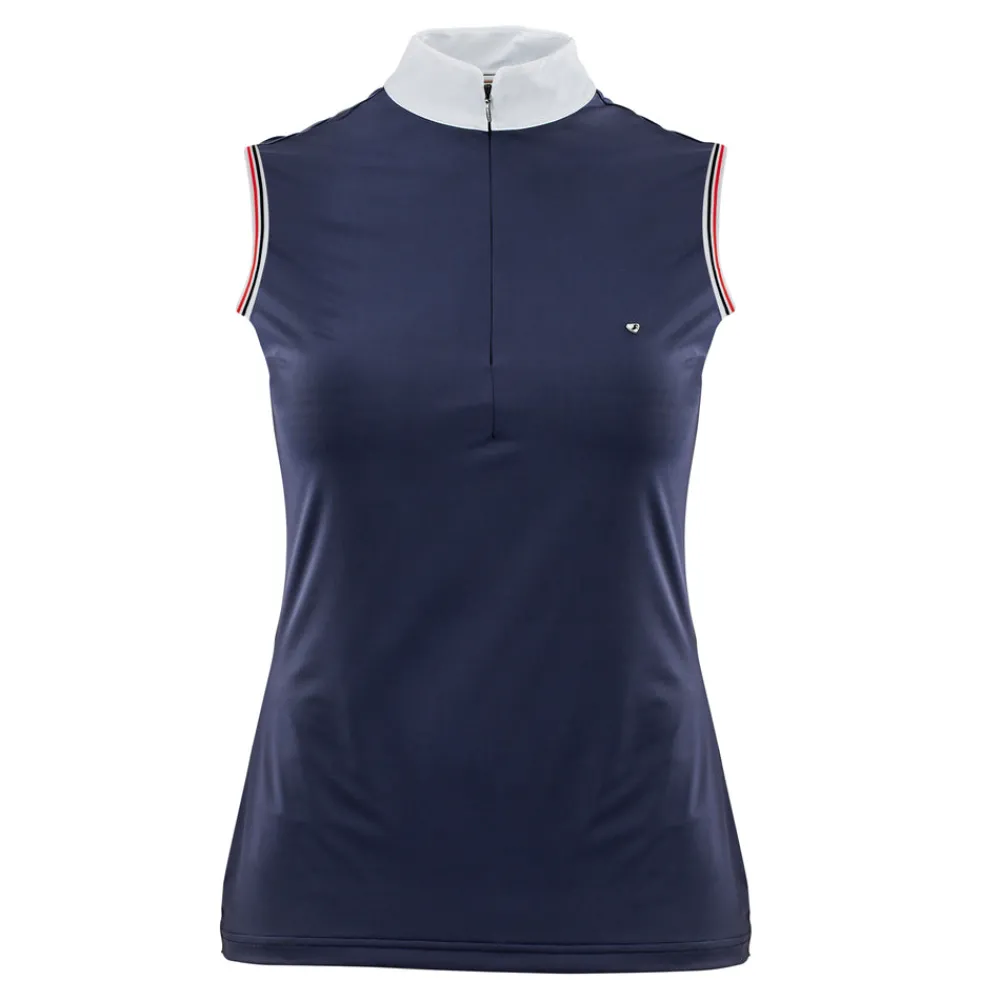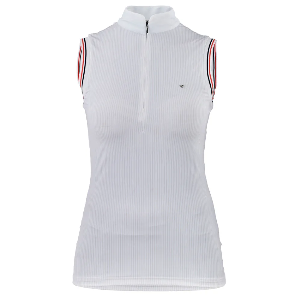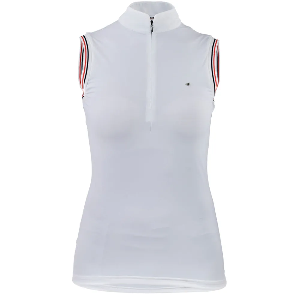 Fresh feeling in looks and performance, the Arcaster show shirt features a sleeveless design making it great in warmer weather. Smooth and quick drying, fabric is light and cool and stretches with the rider’s movement. A highline neck features an inset 1/4 zip fastening to offer additional ventilation out of the arena. A slim contour shape looks neat, sleeves are trimmed with signature stripe knitted cuffs. The back of the shirt is printed with a subtle lattice design that catches the light for added lustre. Further detail: main fabric UPF50+, discrete neck zip, 4-way stretch, moisture wicking, highly breathable, comfort seams, signature ribbon tab, Aubrion badge and prints.