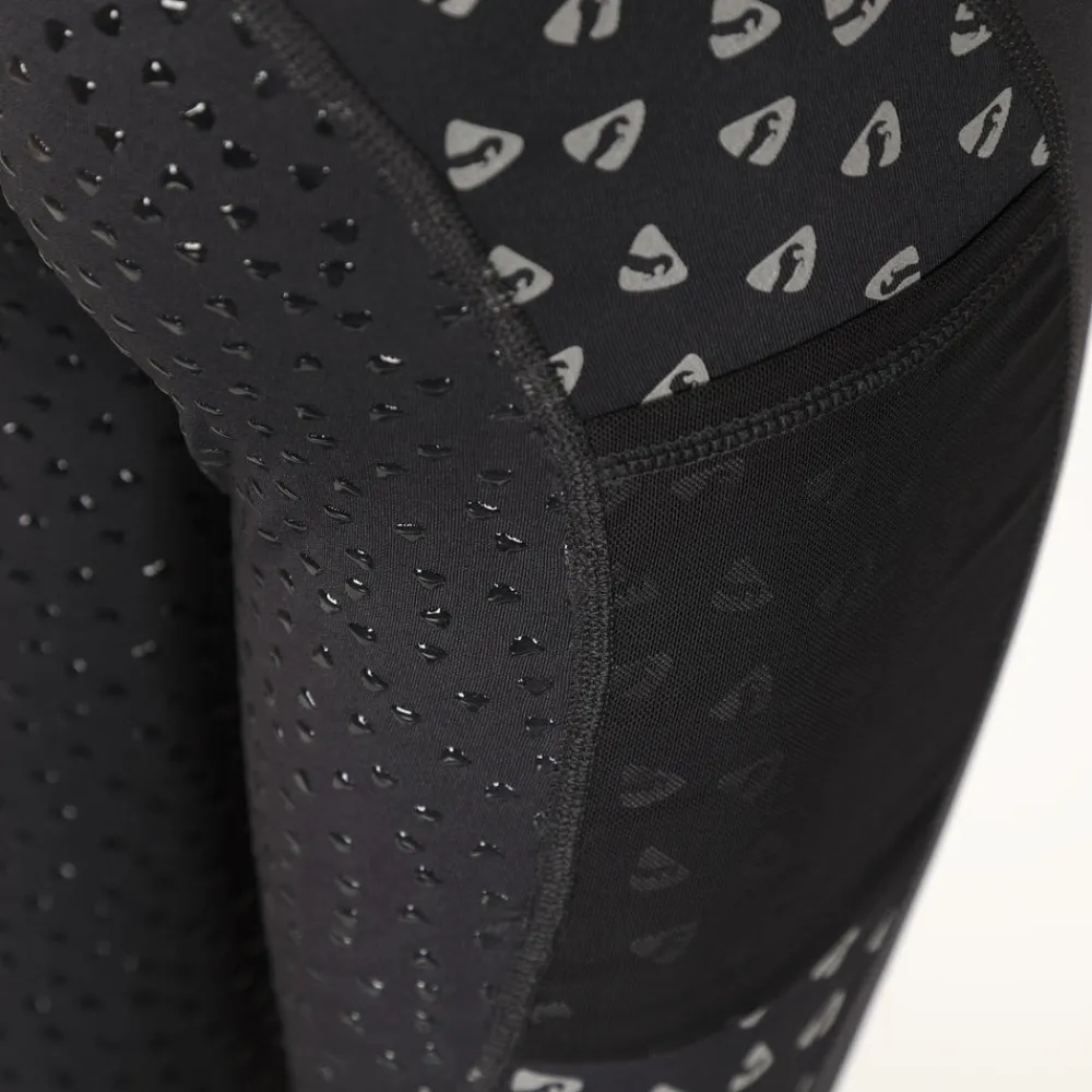 Coombe winter riding tights are designed to keep legs warmer and the rider more visible in low light through the winter. Smooth outer fabric is brushed on the inside to provide fleecy insulation, moisture management keeps skin dry and comfortable. The full length leg prints reflect light in low light conditions to make you extra visible. Further detail: reflective prints, smooth outer, fleecy inner, full silicone grip seat and legs, thigh phone pocket, Aubrion prints.