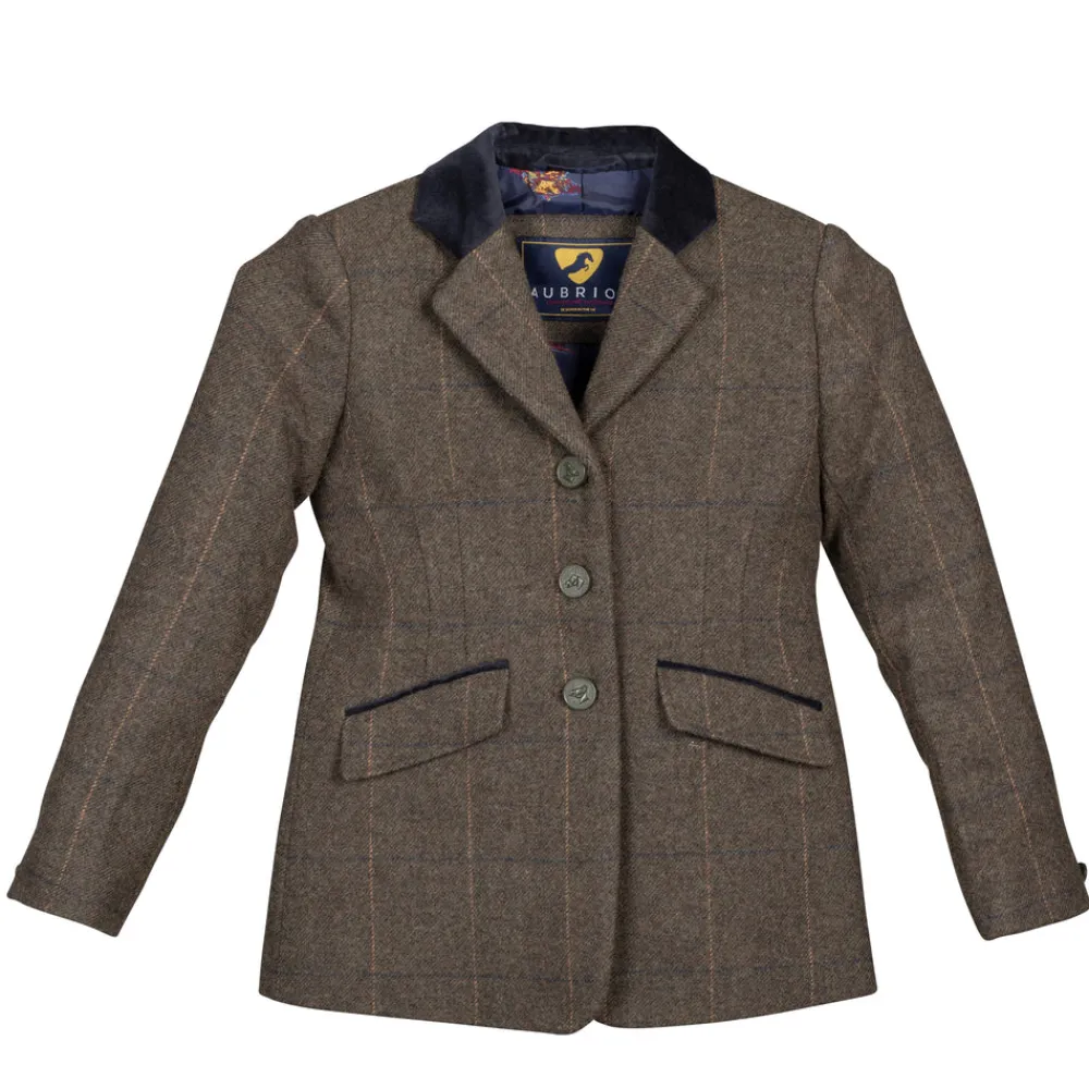 A timeless classic, the Aubrion Saratoga jacket is cut with a flattering modern contour fit, and tailored for free movement in the saddle. Attractive wool rich tweed cloth is complemented by velvet trims at the revere notch collar and pocket flaps, and elegantly finished with a full satin lining. Suitable for a range of disciplines from showing, competition, pony club and countryside pursuits. Style detail: classic fit, velvet trims, 3 button front fastening, button detail at the cuff and back vents, two flap pockets, full satin lining. Double fastening buttons for boys or girls.