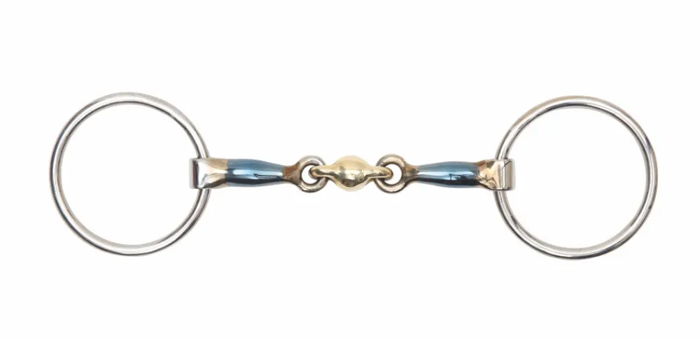 The loose ring cheeks can discourage fixing and leaning as it has much more movement than a fixed cheek. The shaped lozenge offers even pressure and encourages mouthing and contact. Mouthpiece thickness: 15mm. Cheek height: 65mm. Blue sweet iron mouthpieces oxidise easily to create warmth with a sweet taste which helps with bit acceptance and encourages salivation. Please note the blue colour will fade with use. Stainless steel is used for the cheeks due to it being durable, easy to clean and resistance to rust.