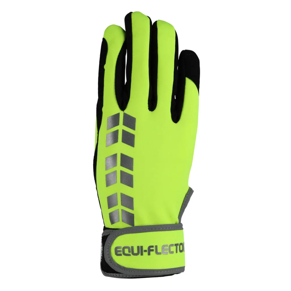 Ensure maximum visibility with these EQUI-FLECTOR® riding gloves. Made from bright bonded fleece fabric with soft fleecy inner lining, the gloves feature silicone printed palms for extra grip on the reins, reflective strips and elasticated adjustable wrists.