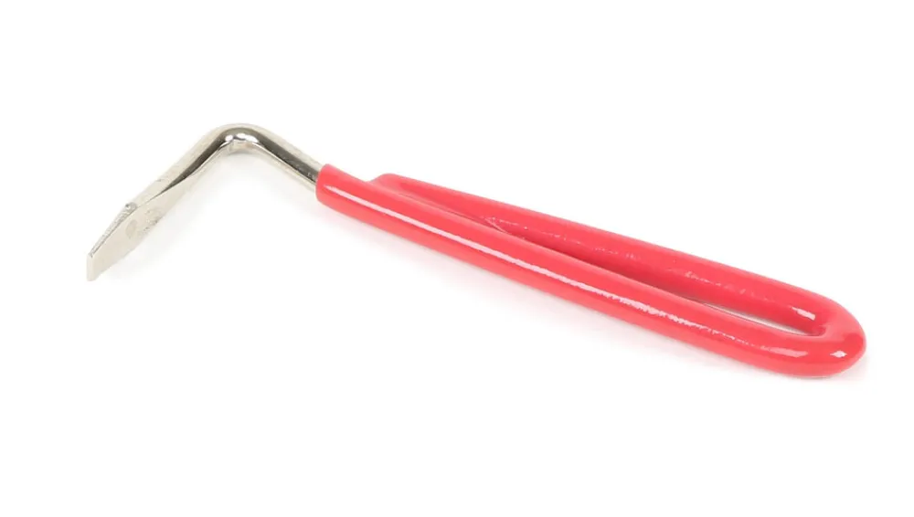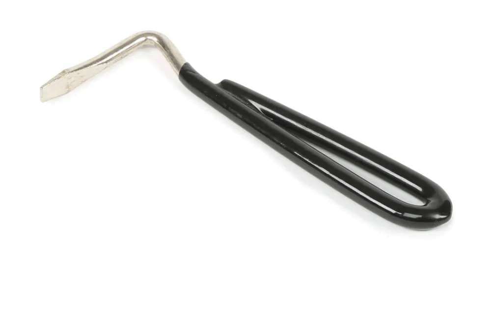 Metal hoof pick with vinyl coated handle.