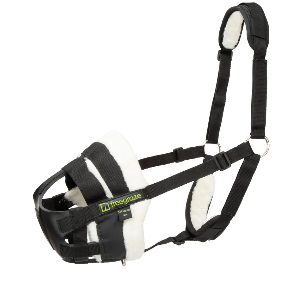 FreeGraze grazing muzzles are proven to help with controlled or restricted feeding regimes and special diets. Offering enhanced airflow around the nostrils, the open front configuration ensures plenty of ventilation. Cut back under the chin to avoid unnecessary pressure, synthetic wool lining protects against chafing for enhanced comfort. The rubber base curves up around the muzzle to offer unrestrictive space, a hole at the bottom allows grass to enter to allow restricted grazing. The fully adjustable harness benefits from padded synthetic wool lining at the head and throat and is fitted with two field safe fastenings. A lead rope can be attached to the D-ring for leading to and from the field. It is recommended that wear time is built up gradually.