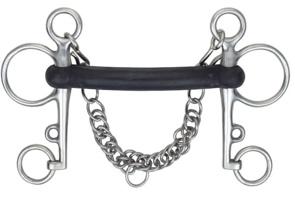 The hard rubber used in this pelham allows less movement but is still thick and gentle. Can be used with double reins or pelham roundings. Mouthpiece thickness: 19mm. Cheek height: 115mm (4.5″), 130mm (5″), 140mm (5.5″ – 6″). Rubber covered mouthpieces are generally thicker, making them softer and particularly suited to sensitive mouths. Available as mild, flexible rubber or treated with heat to produce a harder rubber which has a slightly stronger action. It is important that the horse salivates effectively using rubber mouthpiece bits. Stainless steel is used due to it being durable, easy to clean and resistance to rust.