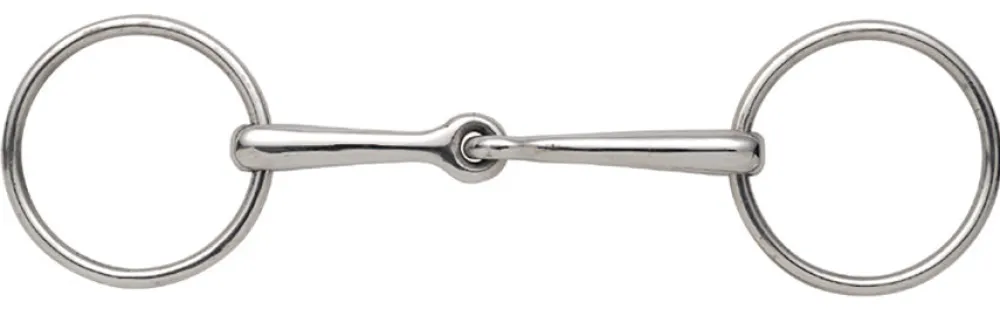 This is a basic jointed mouth snaffle with loose rings to allow more movement in the horse’s mouth. Mouthpiece thickness: 13mm. Cheek height: 40mm (4.5), 65mm (5 – 6). Stainless steel is the most common material for bits. Durable, easy to clean, tasteless and does not rust.