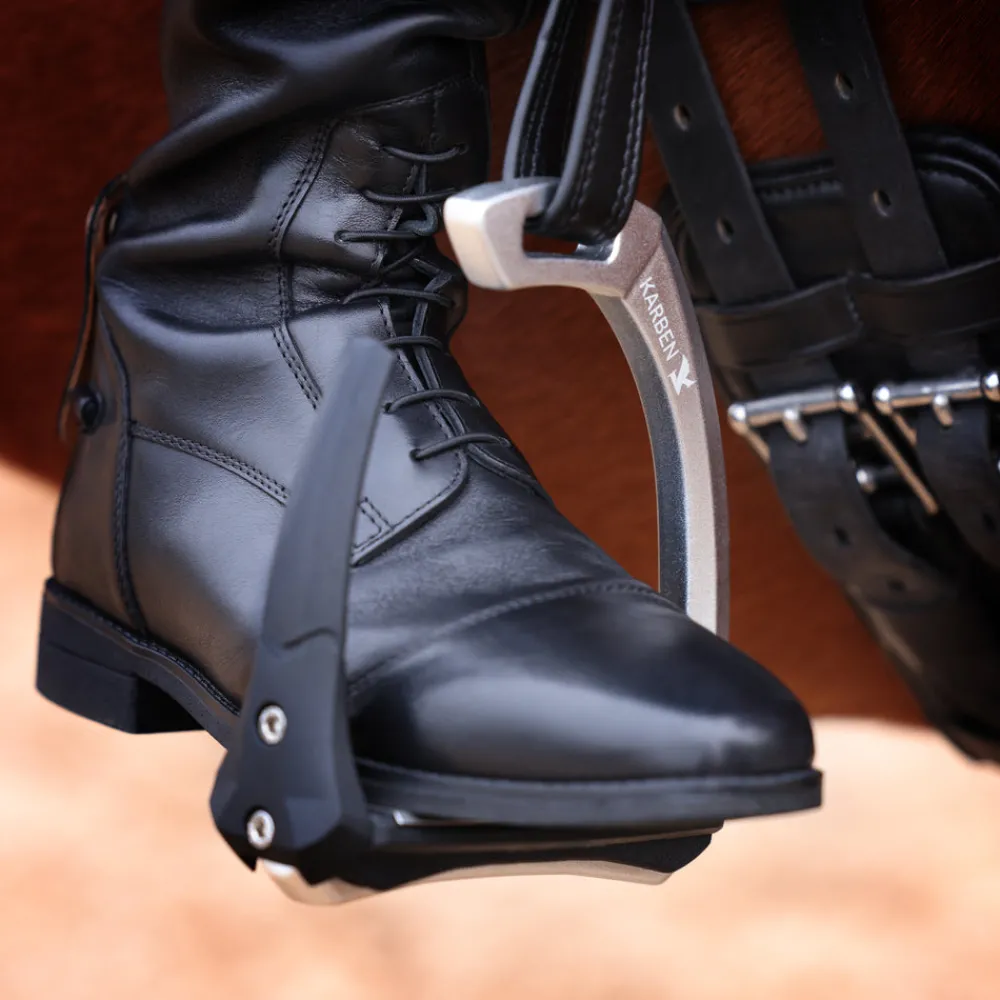 Thoughtfully proportioned and carefully balanced, the Karben Ultra Grip FX Stirrup combines attractive aesthetics with reassuring safety benefits. Retaining form under normal circumstance, in the event of a fall the outer safety arm flexes under pressure, allowing escape of the foot and reducing incidence of serious injury to the rider. Following release, the rubber arm retains its original shape and purpose as a supportive lateral arm. The stirrup is designed in ultra-light aluminium, cast for strength and with sleek lines. Low maintenance powder coating gives a durable and attractive finish. The foot plate is deep and secure, deep grip treads give excellent wet or dry traction, making the stirrups ideal for fast work. Secure and stabilising, the weighted base is shock absorbing to keep legs energised. The stirrup’s angled eyelet offers a more naturally optimised hip, knee and foot alignment and assists with retrieval.