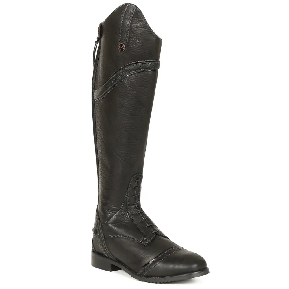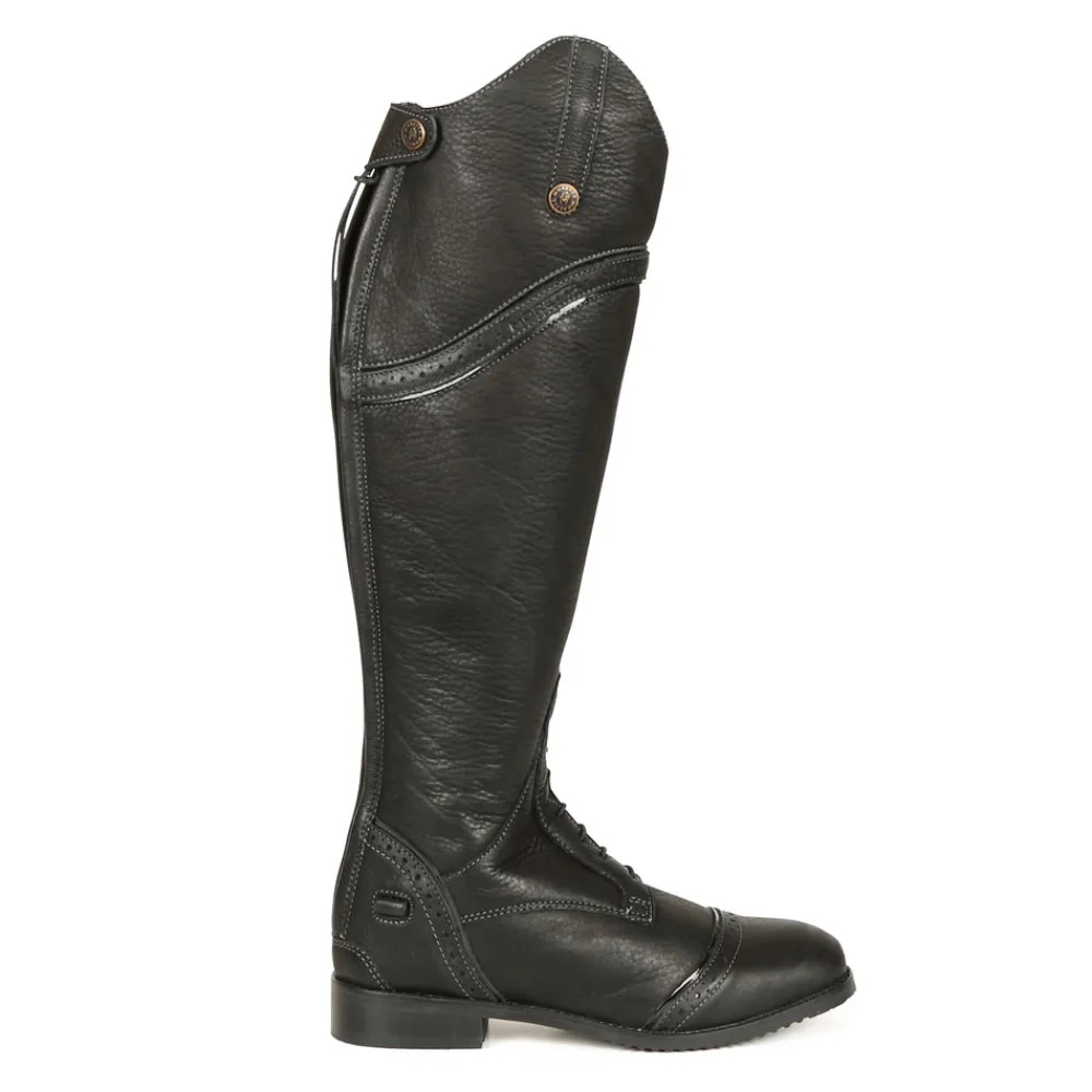 Fine quality riding boots with premium fit and stretch mock laces. Moretta Constantina long riding boots are crafted from full grain leather which is soft to touch. Key features: Premium full grain leather. Full leather lining. Nubuck calf grip. Stretch mock lace detail. Brogue detail. UltraFit leg panel. YKK zip. Upper leather zip security tab. Leather grip spur rest. ActiveFlex insole with Impact Support System. Moretta composite riding outsole. Steel shanks.