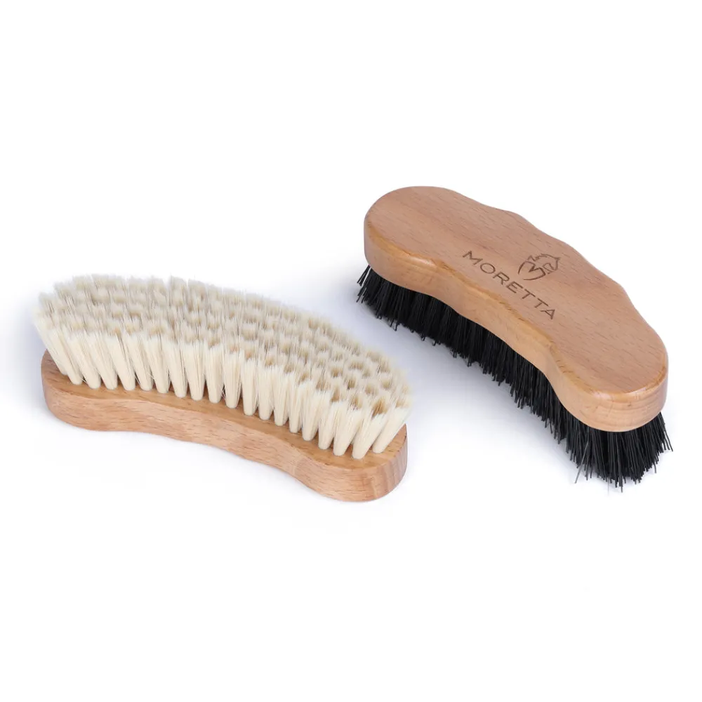 Keep your polished footwear looking show-ready with the Moretta shoe brush set. Comprising of a stiff brush for applying the polish and a soft brush for buffing to a high shine. Suitable for use with creams, waxes and polishes. Clean bristles with liquid soap and warm water to remove residues. Beech block backs with polypropylene bristles. Dimensions: 40mm x 125mm with 22mm bristles. Set of 2. Keep shoes, boots and trainers in top condition and looking great with the Moretta care range.