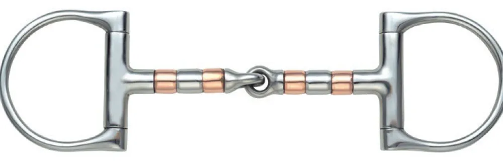 The rollers on this bit can help to prevent the horse taking a hold but can also encourage mouthing. The D-rings help with steering and prevent the bit from being pulled through the mouth. Mouthpiece thickness: 14mm. Cheek height: 65mm. Stainless steel is the most common material for bits. Durable, easy to clean, tasteless and does not rust. Copper is used in the mouthpiece, creating warmth and encouraging salivation to keep the mouth soft.