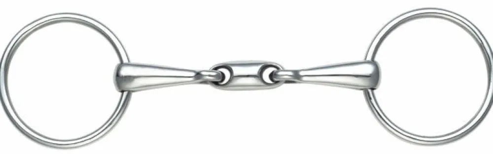 The thicker mouthpiece distributes pressure over a larger area. The lozenge helps to encourage a softer contact. Mouthpiece thickness: 18mm. Cheek height: 65mm. Stainless steel is the most common material for bits. Durable, easy to clean, tasteless and does not rust.