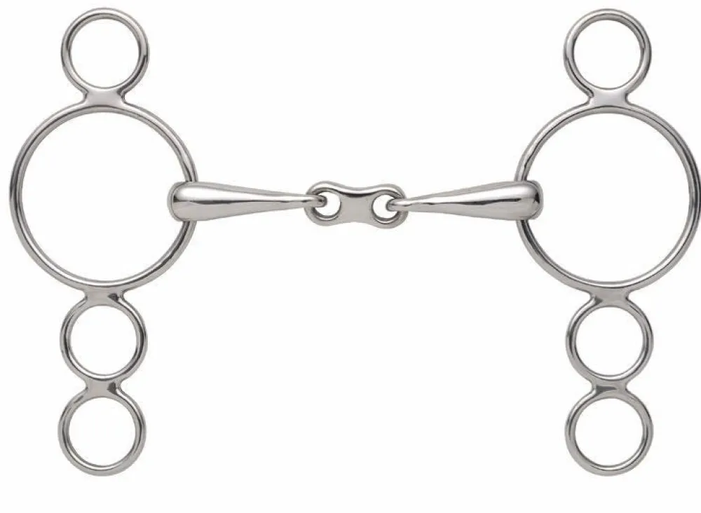 The French link in this bit means pressure is applied to both sides of the tongue. Some horses with low palates may find this bit more comfortable as the mouthpiece should not come into contact with the palate when the bit is in action. The three rings offer leverage options to increase severity. Mouthpiece thickness: 16mm. Cheek height: 150mm (4.5″, 5″), 180mm (5.5″). Stainless steel is the most common material for bits. Durable, easy to clean, tasteless and does not rust.