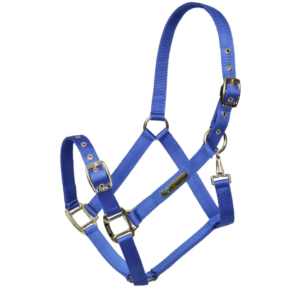 The ARMA adjustable headcollar benefits buckle fastenings at the head and nose and a convenient clip-on throatlash. Made with double layer durable polypropylene webbing and trimmed with high shine gold colour fittings and an ARMA plate.