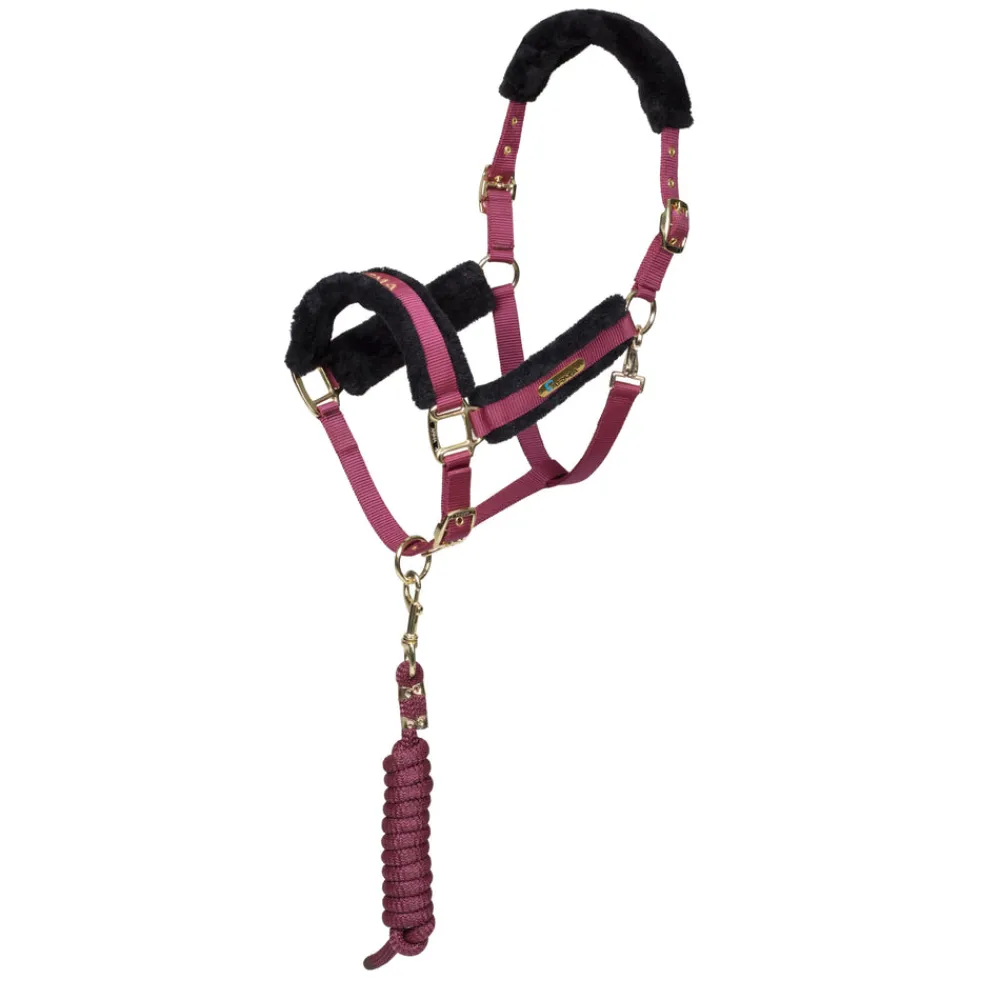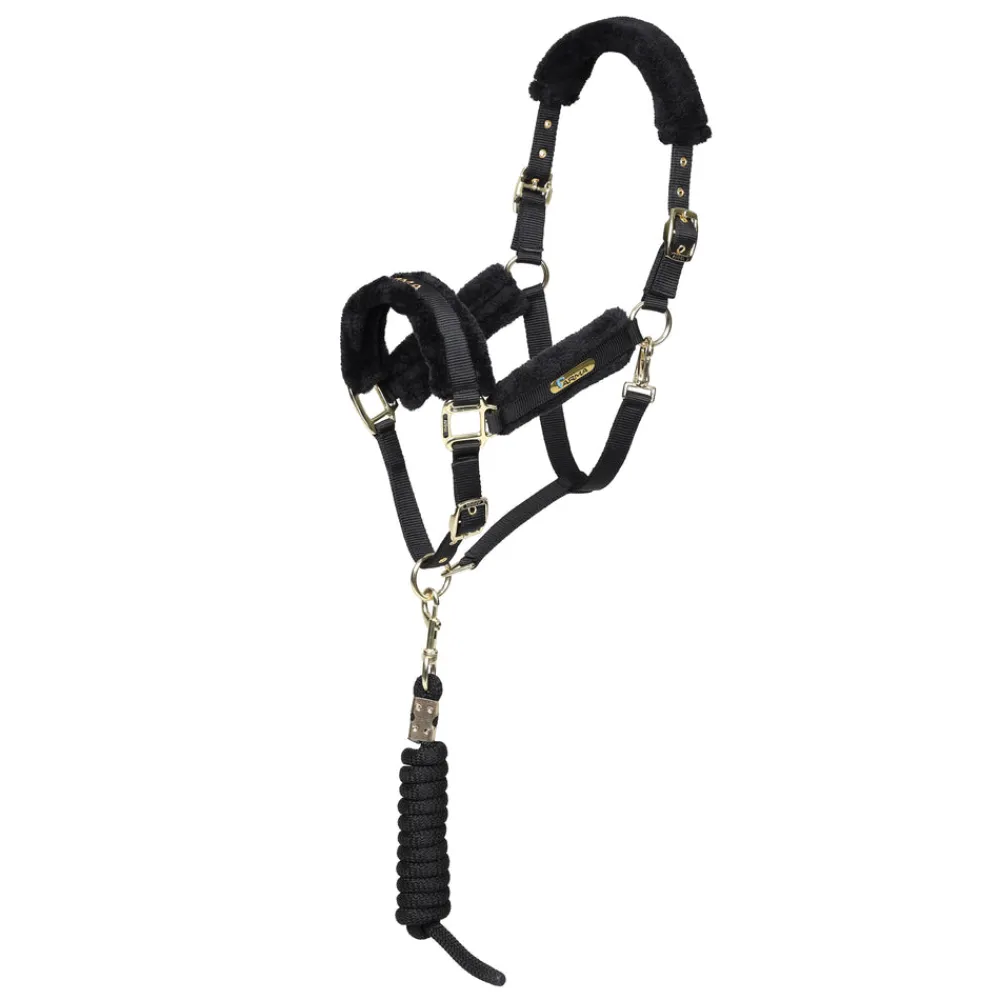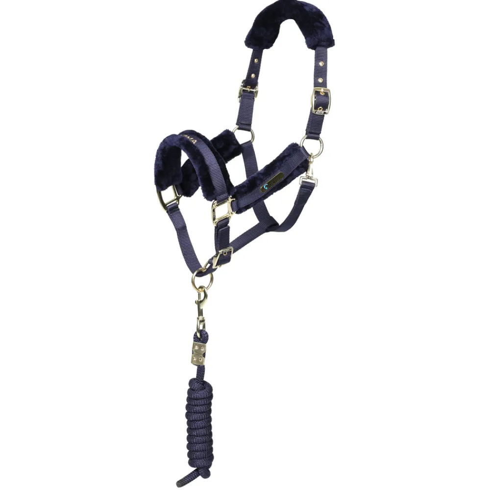 Treat your horse to a coordinated new look, the ARMA faux fur headcollar and matching lead rope are accessorised with high shine fittings for a luxe feel. Fully adjustable both sides of the head and at the nose with a clip throatlash for convenience and made from durable polypropylene webbing. Cushioned trims alleviate pressure in key areas and look smart teamed with gold embroidery across the noseband. An ARMA plate for distinctive style.