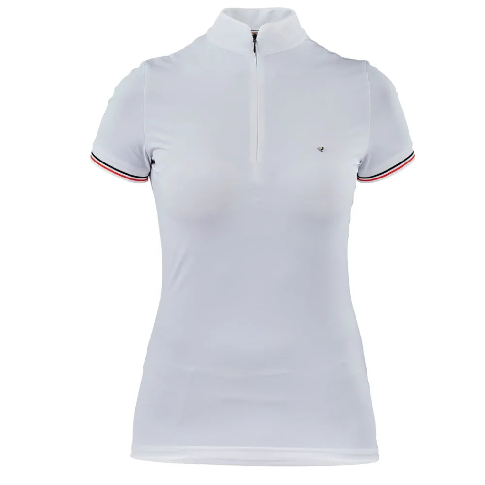 Fresh feeling in looks and performance, the Arcaster short sleeve show shirt has timeless appeal. Smooth and quick drying, fabric is light and cool and stretches with the rider’s movement. A highline neck features an inset 1/4 zip fastening for additional ventilation out of the arena. A slim contour shape looks neat, sleeves are trimmed with signature stripe knitted cuffs. The back of the shirt is printed with a subtle lattice design that catches the light for added lustre. Further detail: main fabric UPF50+, discrete neck zip, 4-way stretch, moisture wicking, highly breathable, comfort seams, signature ribbon tab, Aubrion badge and prints.