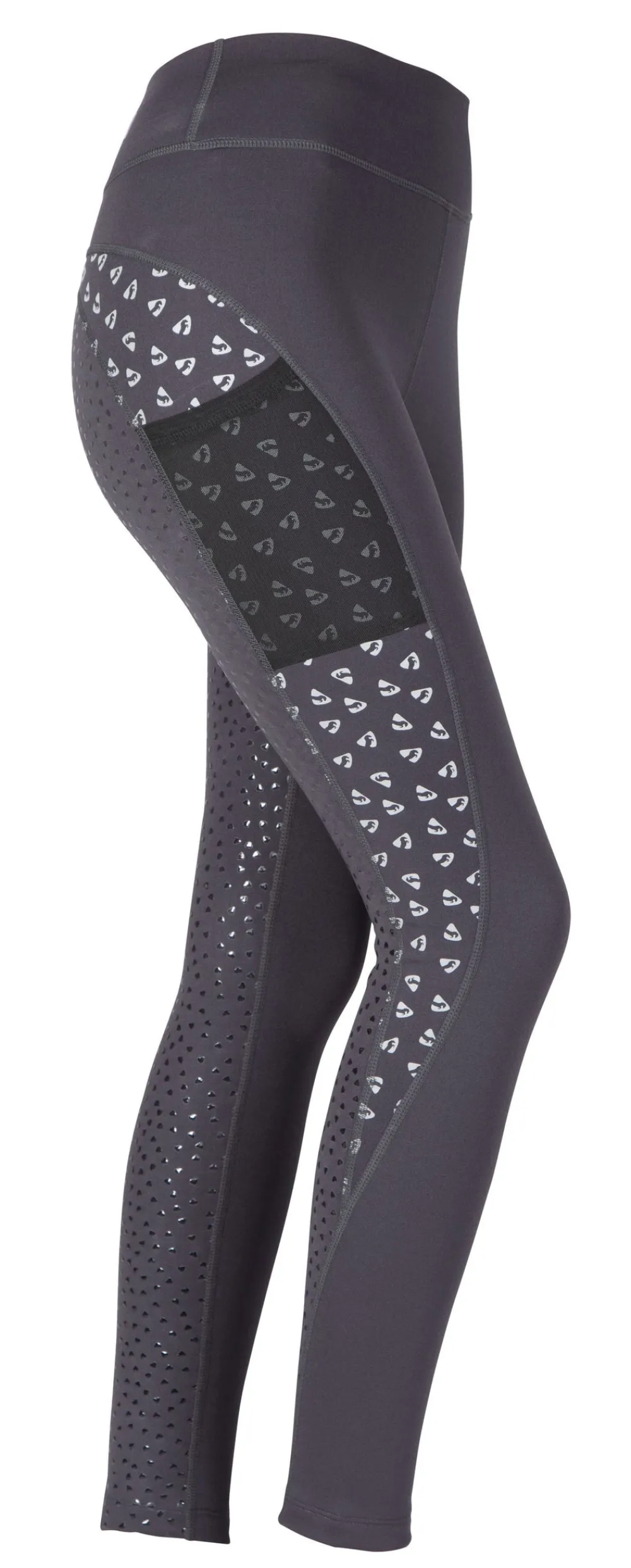 Coombe winter riding tights are designed to keep legs warmer and the rider more visible in low light through the winter. Smooth outer fabric is brushed on the inside to provide fleecy insulation, moisture management keeps skin dry and comfortable. The full length leg prints reflect light in low light conditions to make you extra visible. Further detail: reflective prints, smooth outer, fleecy inner, full silicone grip seat and legs, thigh phone pocket, Aubrion prints.