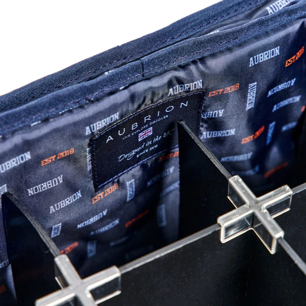 The Aubrion Equipt grooming kit bag keeps your kit organised and easy to access. The zip opening bag features an inner eight part divider, ideal for transporting bottles and keeping everything quick to find. A mesh ventilation panel keeps the air flowing for freshness. Further detail: two padded handles, hardwearing feet, Aubrion prints. Dimensions: W.34cm, D.15cm, H.26cm. Part of the smart Aubrion Equipt luggage range.