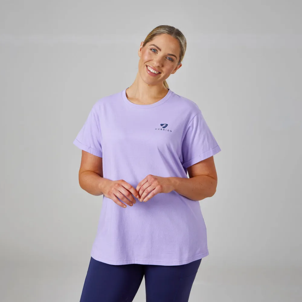 The Repose t-shirt looks equally good paired with jeans or riding tights. Styled for a casual look with a dipped hem and turn-up short sleeves, satin inner neck binding and printed logos add interest. Further detail: soft touch 100% cotton fabric, relaxed round neck, turned up sleeves, dipped hem, Aubrion prints.