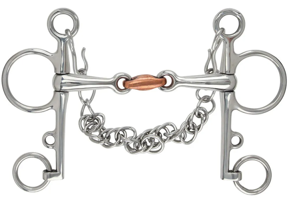 This double jointed pelham is often used to help control. The double joint with copper lozenge will soften the nutcracker action and assist with salivation. Mouthpiece thickness: 16mm. Cheek height: 125mm (4.5″), 130mm (5″), 140mm (5.5″). Stainless steel is the most common material for bits. Durable, easy to clean, tasteless and does not rust. Copper is used in the mouthpiece, creating warmth and encouraging salivation to keep the mouth soft.