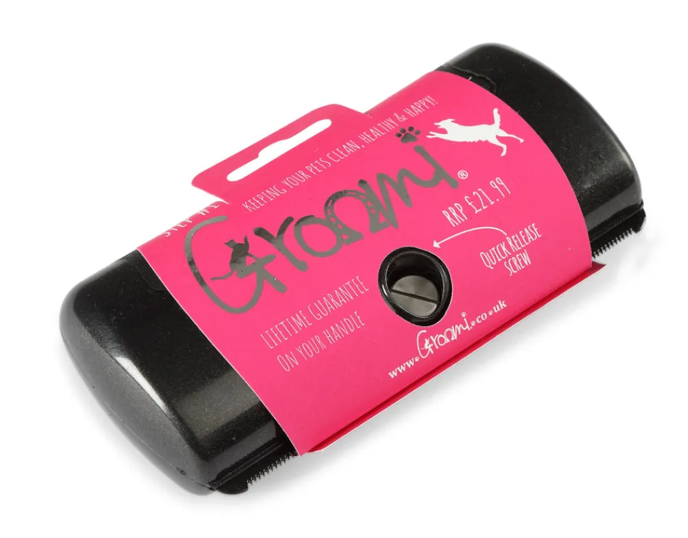 Groomi is a stylish and durable coat shedding assistant for horses, dogs and cats. It works by gently pulling through the animal’s coat to remove loose hair, dirt and dandruff in an effective yet humane manner. Removing this hair allows your pets coat to breath, encourages the natural oils to the surface giving a shiny healthy coat. The results Groomi achieves are unrivalled in the market and it’s all thanks to the unique toothed comb which is designed to be gentle yet effective. No cutting, no dragging, no pain.100% satisfaction guarantee. Lifetime guarantee on the handle. Groomi tool includes one blade. Replacement blades available separately.