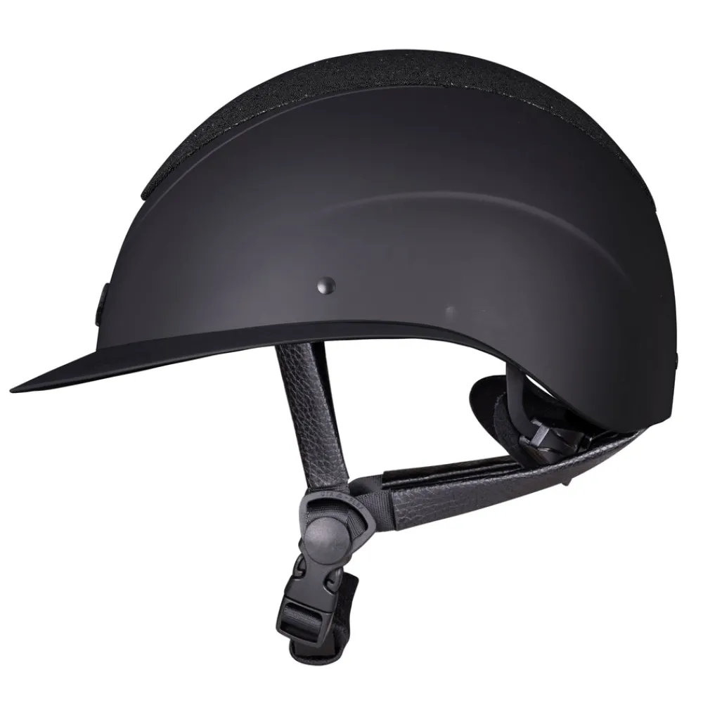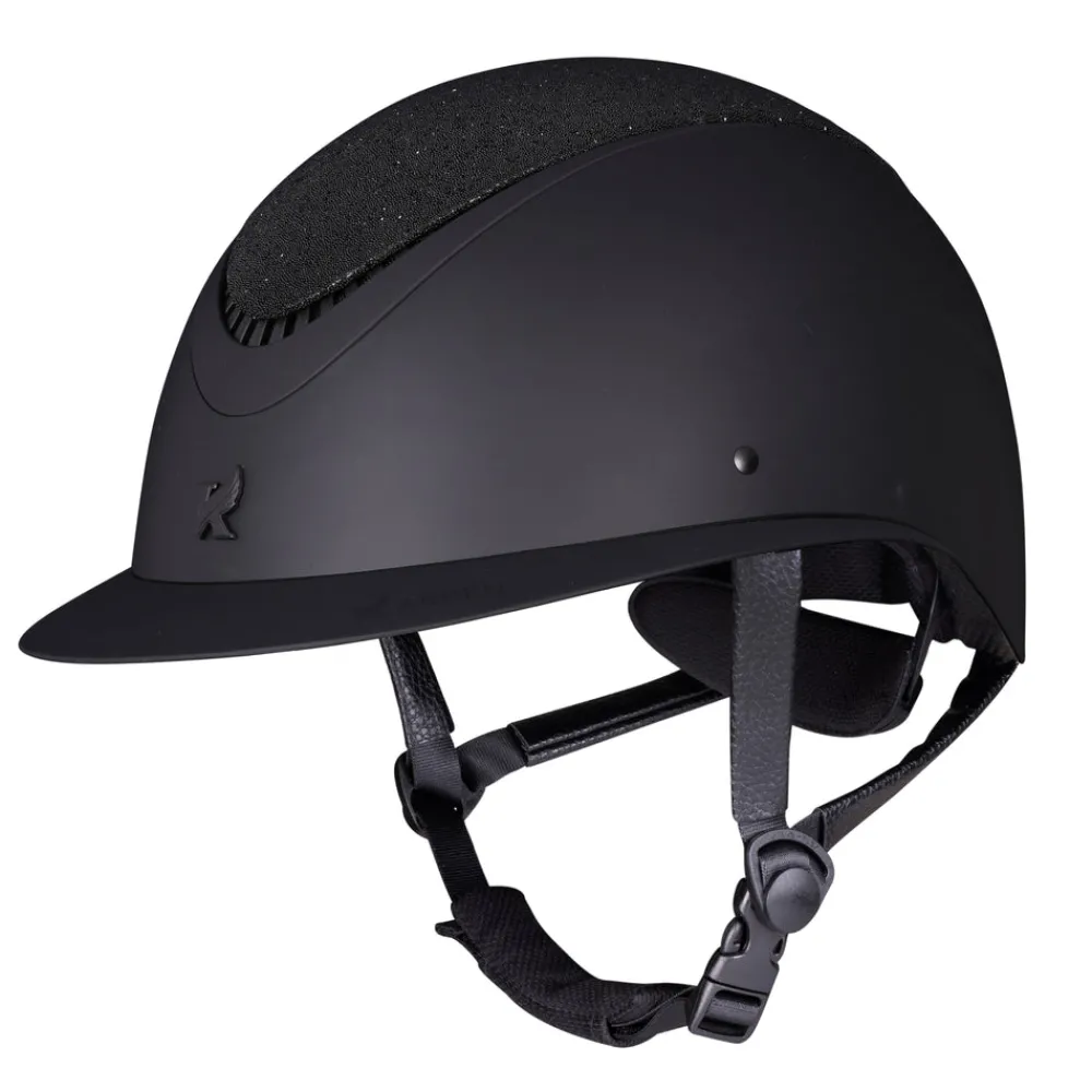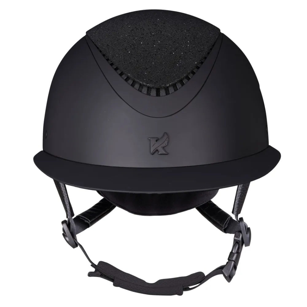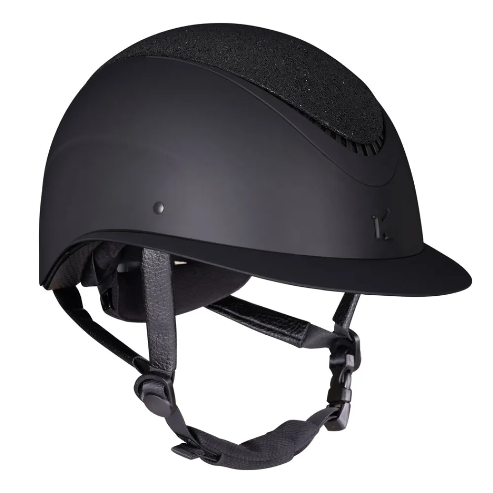 All eyes on you! Fine tune your fit with dial adjusted Karben Ellipse riding hats. The Lia features a crystal fabric crown that sparkles from all directions. The signature ellipse frame tapers away for elegance. Designed with carefully balanced geometry, the wide peak frames the face, the low profile sits deep on the head. FINER DETAIL: Scratch resistant carbon wrapped rim. Velvet touch under peak lining. BESPOKE FIT Micro Adjustable Dial System. PASSIVE VENTILATION SYSTEM air channels vent towards the head. SHOCK ABSORBING expanded polystyrene inner shell engineered with targeted ventilation shafts. Flexible fixed peak for impact energy absorption. Deeply padded COMFORT LUXE LINER with CoolDryTM headband and THERMOREGULATING 3D mesh crown. Fully adjustable 4-point harness with soft faux leather wrapped sides. Quick release buckle. Removable anti-rub chin guard. Machine washable linings. Reusable drawstring storage bag. PAS 015:2011 and VG1. BSI Kitemark, CE & UKCA.
