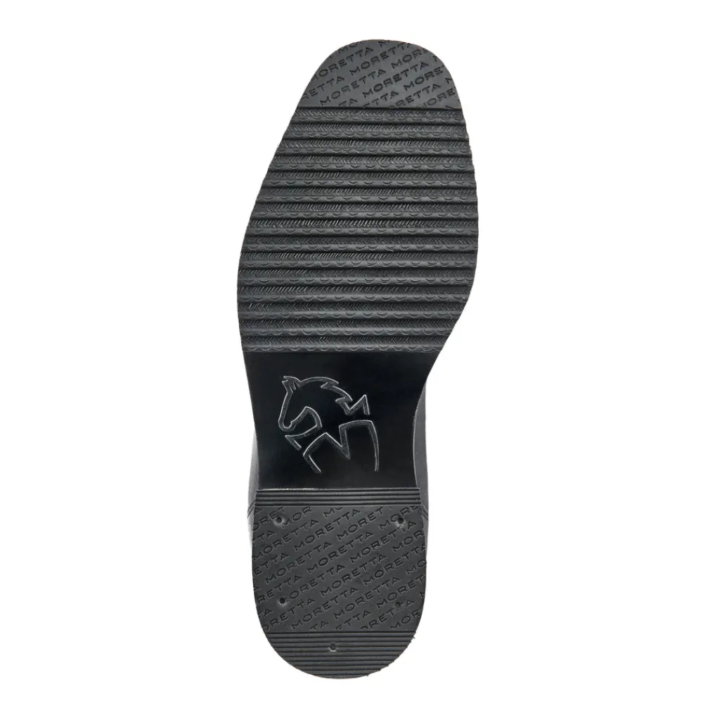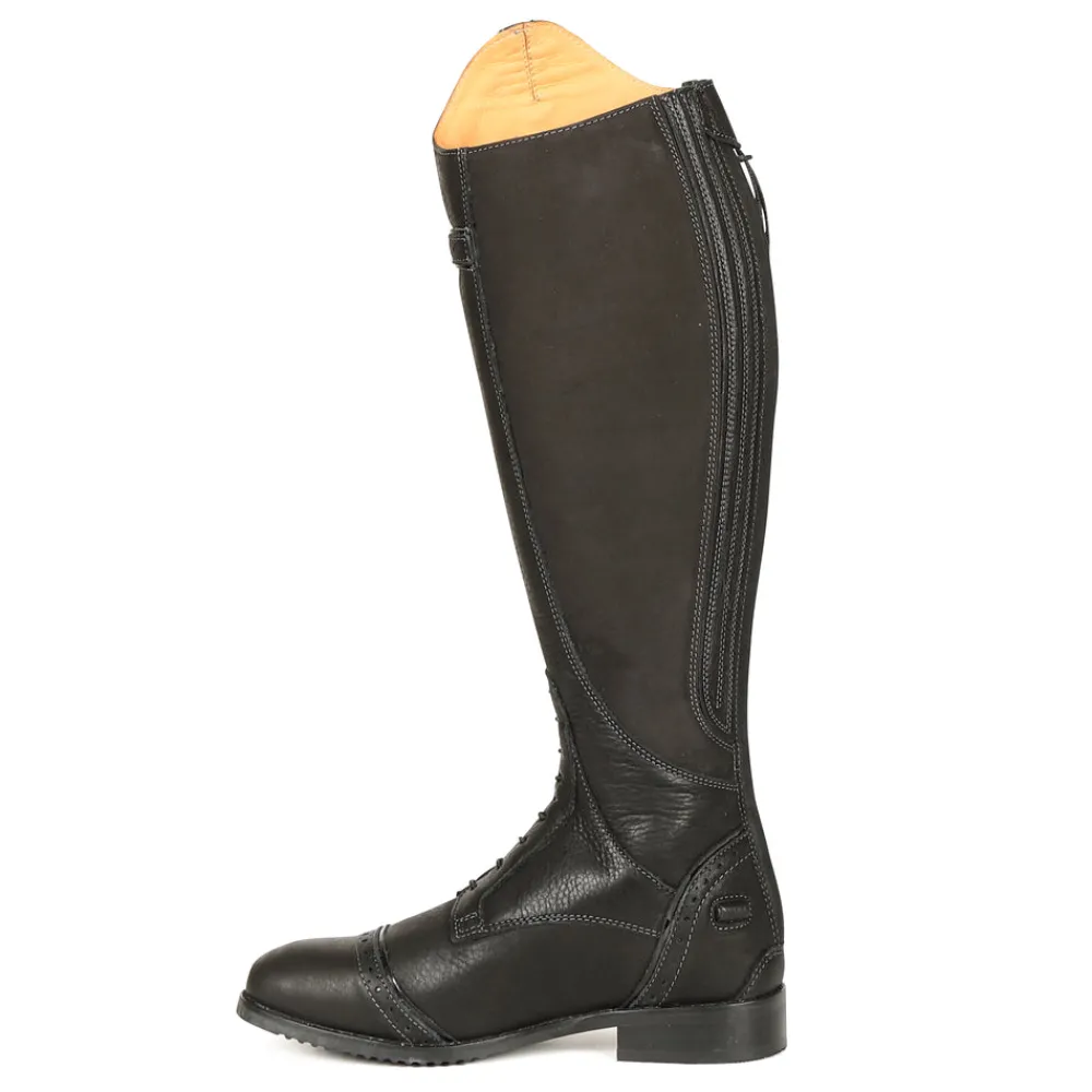 Fine quality riding boots with premium fit and stretch mock laces. Moretta Constantina long riding boots are crafted from full grain leather which is soft to touch. Key features: Premium full grain leather. Full leather lining. Nubuck calf grip. Stretch mock lace detail. Brogue detail. UltraFit leg panel. YKK zip. Upper leather zip security tab. Leather grip spur rest. ActiveFlex insole with Impact Support System. Moretta composite riding outsole. Steel shanks.