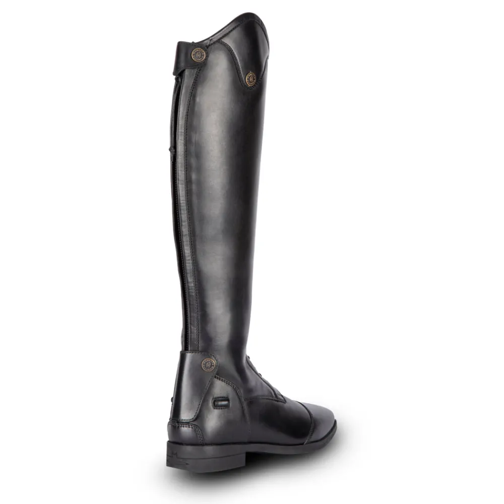 Lift your competition look with the sleek lines and elegant detail of Ortona long riding boots. Specially proportioned for young riders, the leg is shaped for a neat profile. Expertly constructed in smooth shape retaining leather, smartly polished to a high sheen finish making them ideal for the arena. The YKK® zip system offers a free running close fit with a contoured shape, zip guards give a tidy finish and protect against wear. A carefully engineered square toe and stretch mock laces offer classic style. Leather covered UltraFit panels sculpt the calf, dressage cut tops further enhance the shape for an elongated leg look. Key features: Milled cow leather. WickAway stay dry lining. Soft piqued leather inner trim. Stretch mock lace detail. Square toe. Dressage cut top. UltraFit leg panel. YKK® zip. Leather zip security tab. Leather zip guard. Leather covered spur rest. ActiveFlex insole. Moretta shock absorbing rubber outsole. Steel shanks.