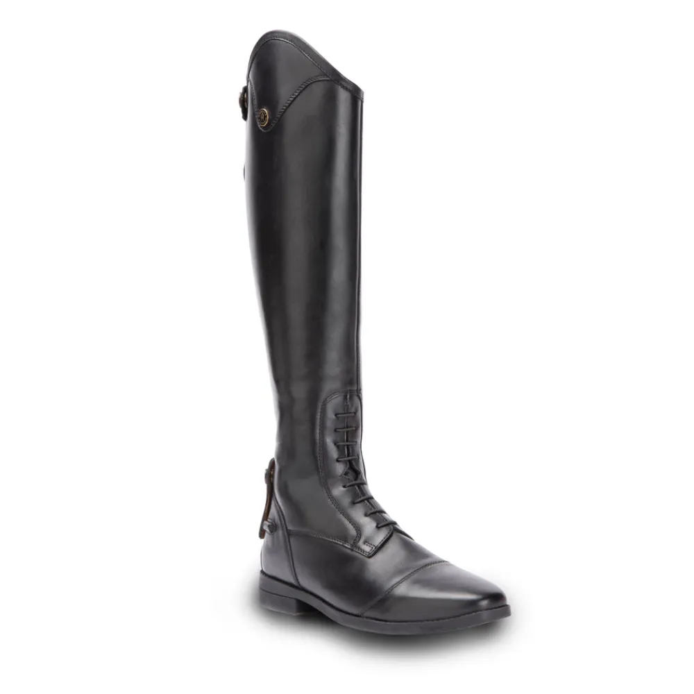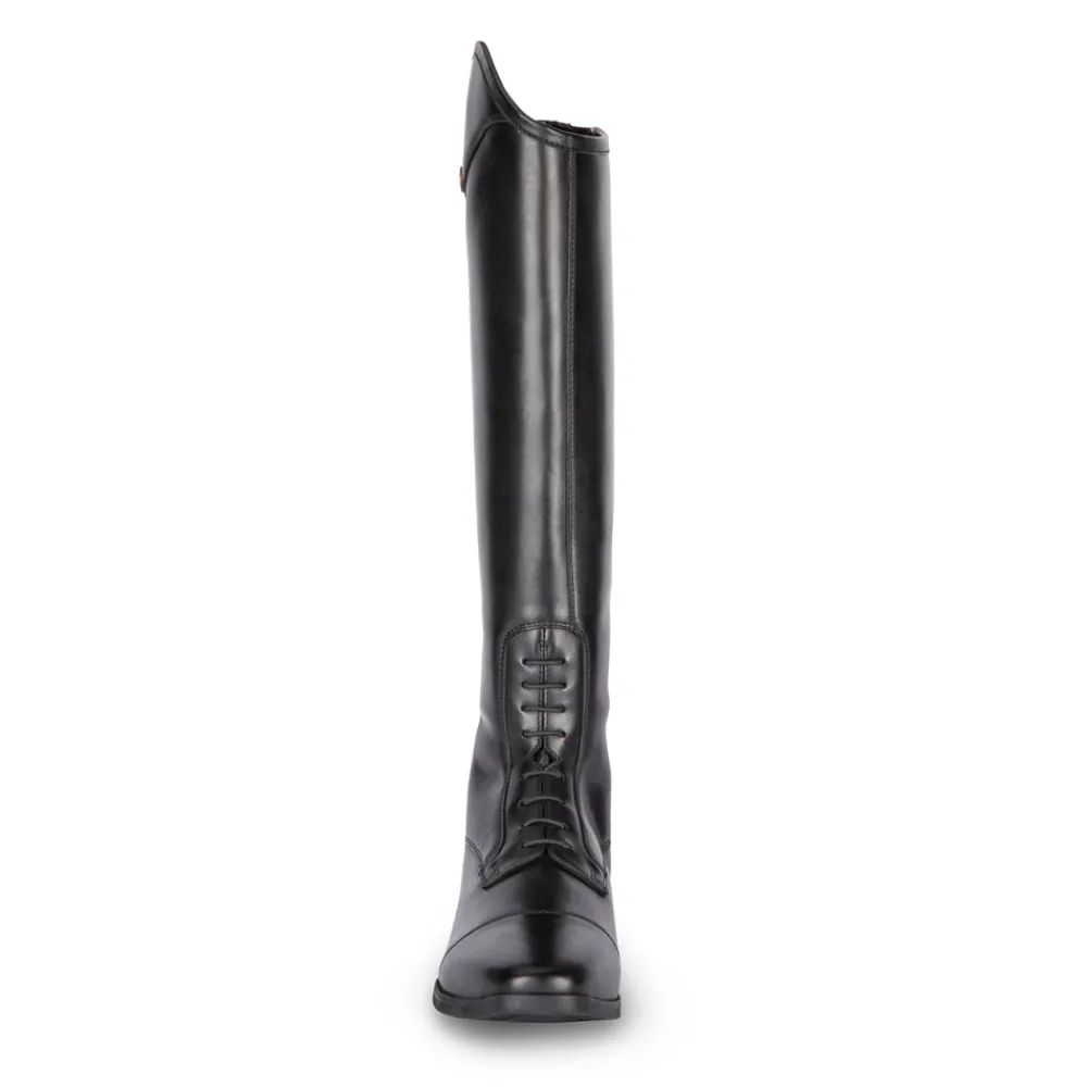 Lift your competition look with the sleek lines and elegant detail of Ortona long riding boots. Available in short, standard and tall heights and multiple calf widths to ensure a neat profile. These expertly designed boots are constructed in smooth shape retaining leather, smartly polished to a high sheen finish making them ideal for the arena. Hand crafted for long lasting reliability, attractive twin needle stitching to all seams gives the boot resilience. The YKK® zip system offers a free running close fit with a contoured shape, zip guards give a tidy finish and protect against wear. A carefully engineered square toe and stretch mock laces offer classic style. Leather covered UltraFit panels sculpt the calf, dressage cut tops further enhance the shape for an elongated leg look. The inside of the boot is trimmed with tan piqued leather and fully lined with moisture wicking 3D mesh for comfort. Supportive insoles and shock absorbing soles ensure feet stay energised in the stirrup. Antiqued metal Moretta badges finish off the look. Key features: Milled cow leather. WickAway stay dry lining. Soft piqued leather inner trim. Stretch mock lace detail. Square toe. Dressage cut top. UltraFit leg panel. YKK® zip. Leather zip security tab. Leather zip guard. Leather covered spur rest. ActiveFlex insole. Moretta shock absorbing rubber outsole. Steel shanks.Â