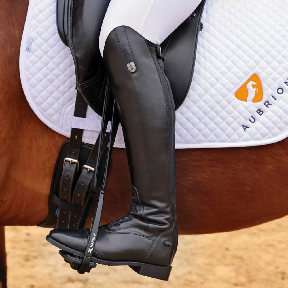 Classically styled and sculpted for advantage in shape-retaining leather, Tivoli offers the ambitious rider a timeless competition wardrobe essential. Full grain leather has a smart, smooth polished finish. The tall height leg gives a classy silhouette featuring antique silver monogram top tabs. The fit enhancing mock stretch lace panel and ergonomic UltraFit leg ensure a neat shape. The boot is fully lined in luxurious tan leather and soft touch comfort lining is positioned at key areas. Elegantly styled with a square toe, a refined heel guard and leather covered spur rests. The anti-fatigue RIDERELIEF+ insole creates comfort from the first wear. A low profile sole is ribbed for stirrup security whilst allowing a close contact feel. Key features: Premium shape retaining leather. Full grain with smooth finish. Full leather lining. UltraFit leg panel. YKK zip. Upper leather zip security tab. Leather grip spur rest. RIDERELIEF+ insole. Moretta composite outsole. Steel shanks.Â