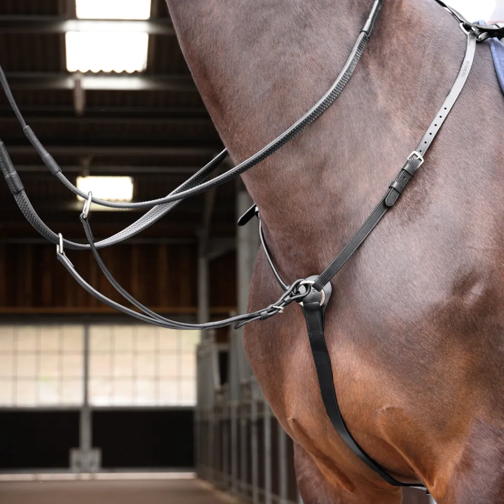 For optimum saddle stability the Velociti GARA hunt weight breastplate can be adjusted at both shoulders, saddle points and girth strap. Complete with removable running martingale attachment and stainless steel fittings. Restrained design gives Velociti GARA leatherwork enduring appeal.