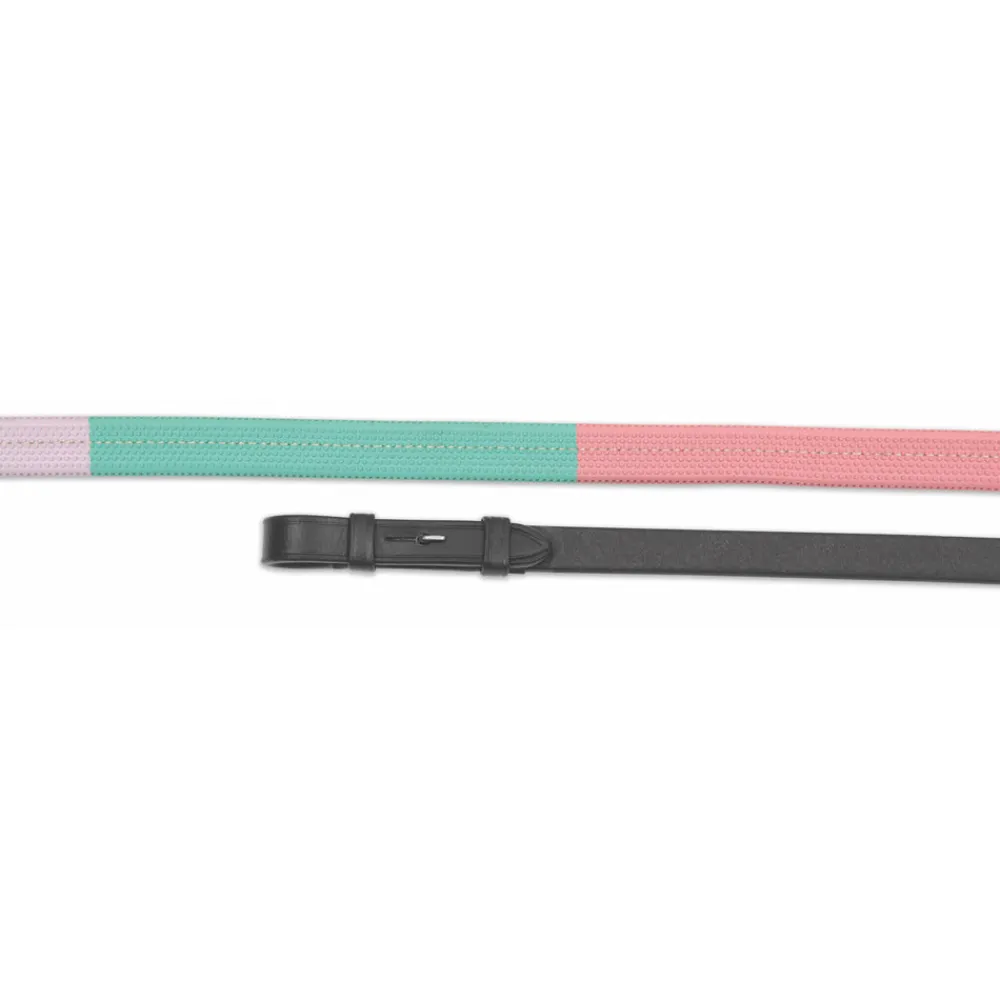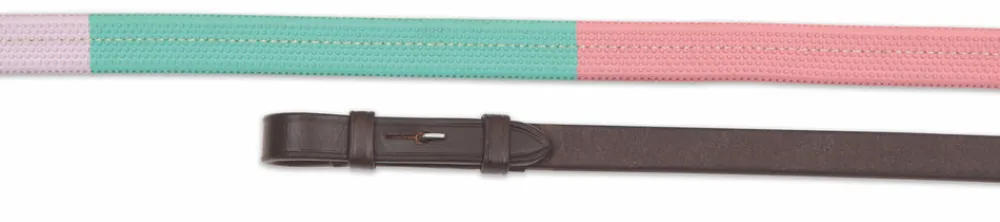 Useful rubber grip reins featuring coloured sections to bring awareness to the rider of their rein holding position. Hook stud billets and stainless steel fittings. Restrained design gives Velociti GARA leatherwork enduring appeal.
