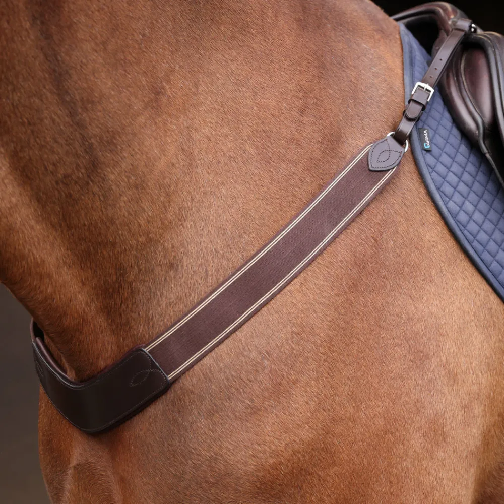 Smart and supportive, the Velociti RAPIDA Elasticated Breast Girth conveniently attaches to the saddle D-rings to help keep the saddle in place during ridden work. Convenient trigger clips enable quick and easy attachment and removal, adjustable straps allow for fit adjustment. A wide cushioned pad at the centre chest helps spread any pressure, the wide elastic straps flex during movement to avoid jolts and enhance comfort for the horse. Supple and hardwearing, leather is eco-friendly vegetable tanned leather, hand-stitched with self-colour thread and finished with high shine stainless steel harness buckles. Coordinates perfectly with bridles in the Velociti RAPIDA range.