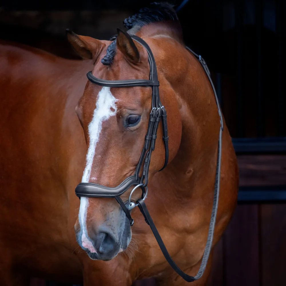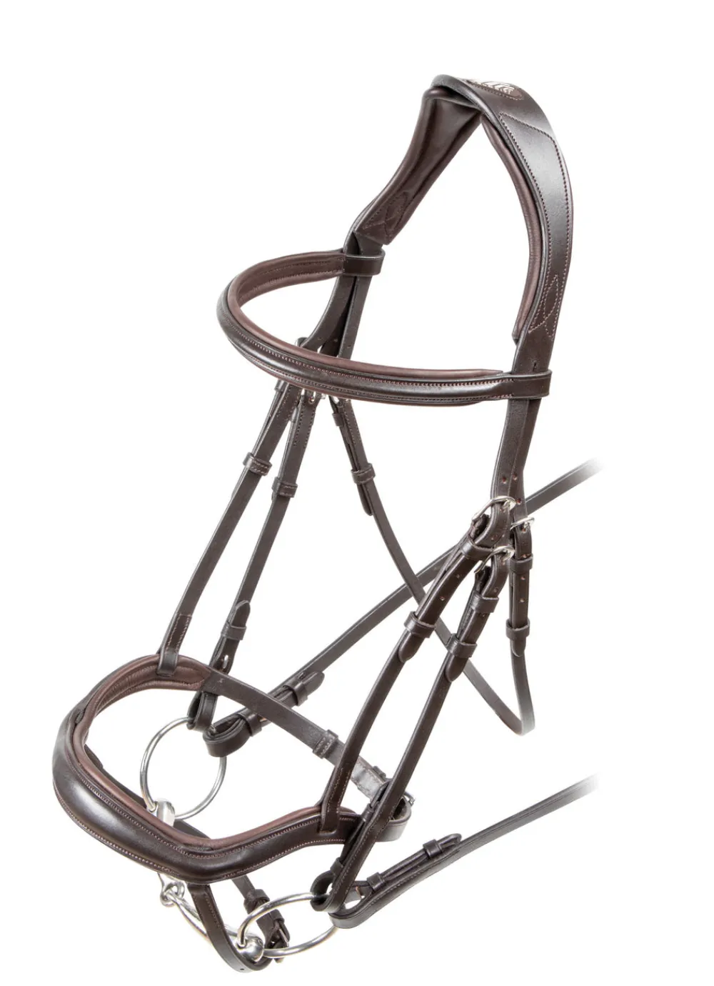 Offering next level freedom and comfort, this Velociti curved flash bridle has been ergonomically designed to avoid the sensitive facial nerves. The unique flash position inhibits evasion of the bit without impeding free flow of air to the nose, promoting unrestricted breathing. Tech details: FreedomFit headpiece designed to relieve pressure thanks to the wide, cushioned crown with poll gap and cutaway ear profile; soft leather combined with generous, anti-shock padding on the headpiece, browband and noseband; elegant profile due to sleek, angled throatlash; high shine stainless steel harness buckles; signature Velociti reins for flexible and assured grip.