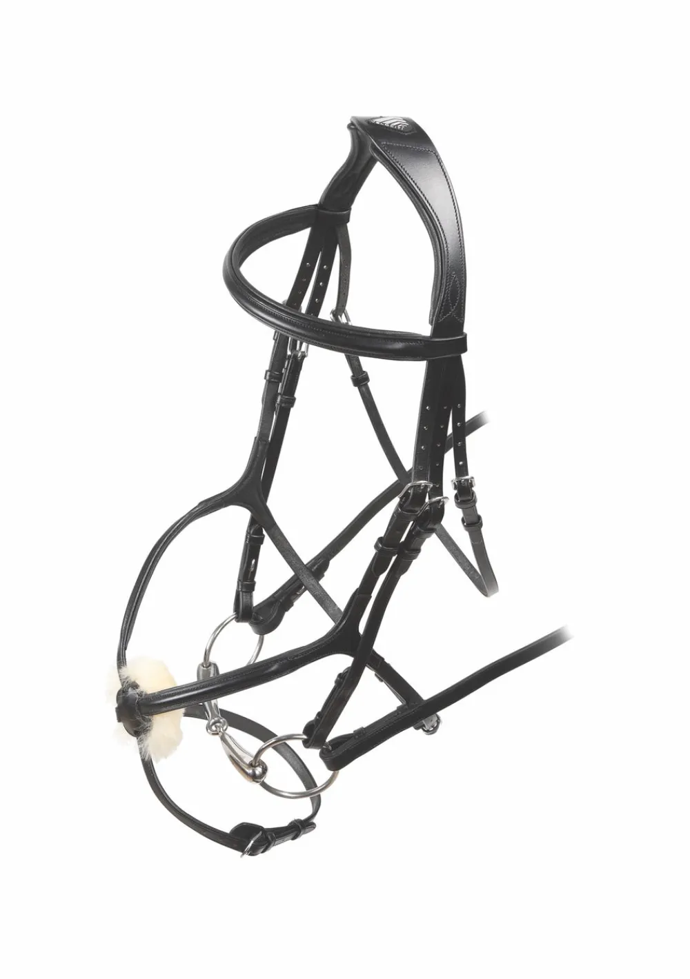 An eye-catching Velociti RAPIDA bridle with sheepskin padding under the grackle noseband for enhanced comfort. Tech details: FreedomFit headpiece designed to relieve pressure thanks to the wide, cushioned crown with poll gap and cutaway ear profile; soft leather combined with generous anti-shock padding on the headpiece, browband and noseband; elegant profile due to sleek angled throatlash; high shine stainless steel harness buckles; signature Velociti RAPIDA reins for flexible and assured grip.